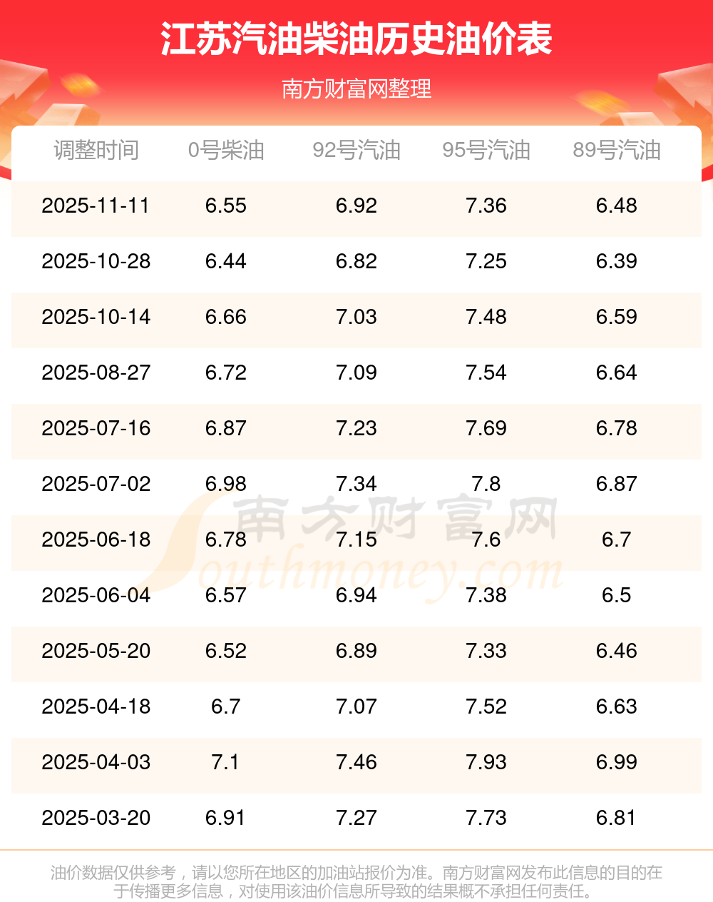 11月18日,江苏0号柴油的价格是6.55元每升,本次的调整时间为11月11日,对比上次的调整上升了0.11元,上升1.708%,下次调整时间为11月24日24时,还有6.13天。