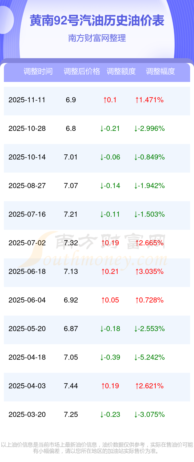 11月18日黄南92号汽油的价格为6.9元每升,本次调整时间为11月11日,相对上次调整时间10月28日的油价6.8元每升,上调了0.1元,上调幅达1.471%。下一轮油价调整时间11月24日24时,距离现在还有6.11天。