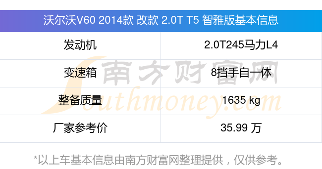沃尔沃V60 2014款 改款 2.0T T5 智雅版动力方面,搭载的是一台2.0T245马力L4涡轮增压发动机,匹配8挡手自一体自动档变速箱,燃料形式为汽油,常规整备质量1635kg,厂家参考价35.99万元。