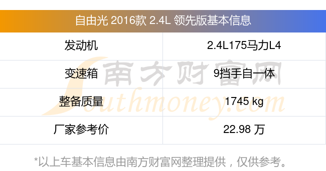 自由光 2016款 2.4L 领先版搭载了一台2.4L175马力L4自然吸气发动机,采用9挡手自一体自动档变速箱,常规整备质量1745kg,厂家参考价22.98万元。