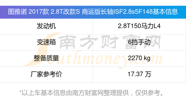 在动力方面,图雅诺 2017款 2.8T改款S 商运版长轴ISF2.8s5F148搭载的是一台2.8T150马力L4涡轮增压发动机,匹配6挡手动挡变速箱,燃料形式为柴油,常规整备质量2270kg,厂家参考价17.37万元。
