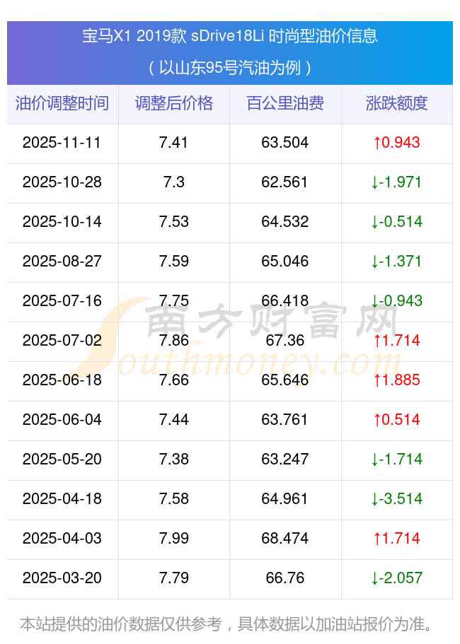 按11月11日95号汽油最新调整价格7.41元每升来计算(以山东为例),该车型百公里平均油费为63.504元,按上一轮10月28日调整价格7.3元每升来计算,百公里平均油费为62.561元,对比上一轮多花0.943元,下一轮油价调整时间为11月24日24时。