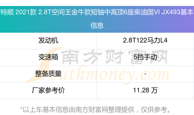 特顺 2021款 2.8T空间王金牛款短轴中高顶6座柴油国VI JX493动力上搭载的是一台2.8T122马力L4涡轮增压发动机,匹配5挡手动挡变速箱,燃料形式为柴油,厂家参考价11.28万元。