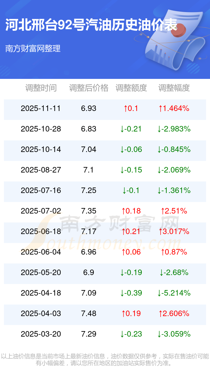 河北邢台92号汽油11月18日价格(11月11日调整后的价格):6.93元每升,对比上次调整(10月28日)的价格6.83元每升升了0.1元,升幅达1.464%。下一轮油价调整时间11月24日24时,距离现在还有6.07天。