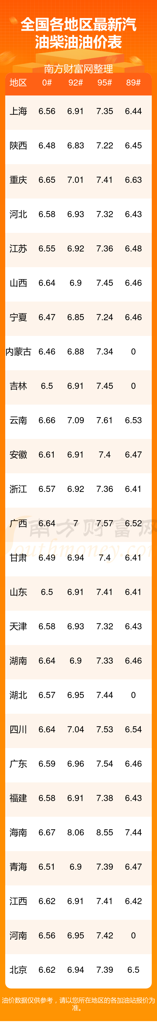 2025年11月19日全国油价调整及最新汽油价格表