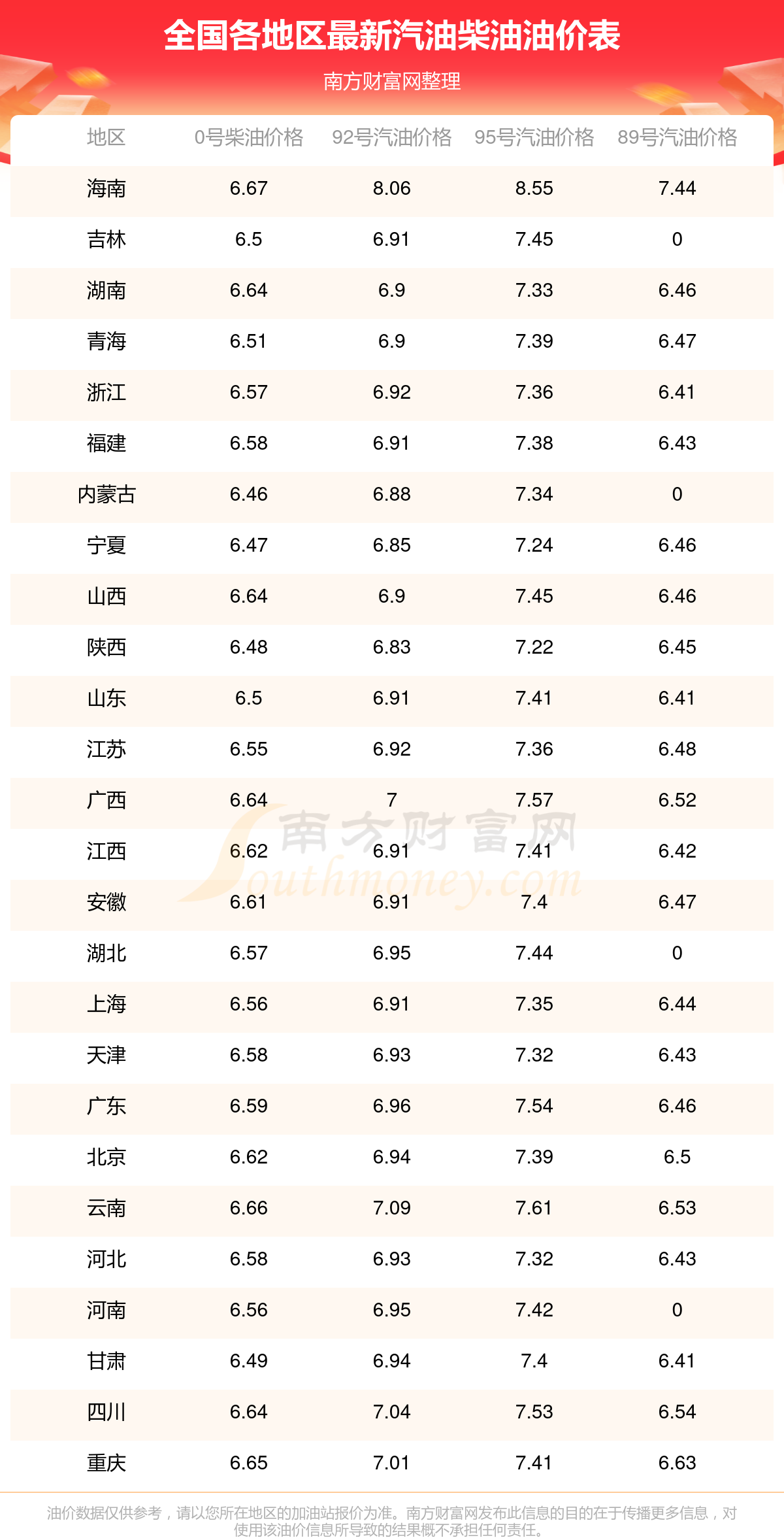 全国各地区最新油价表