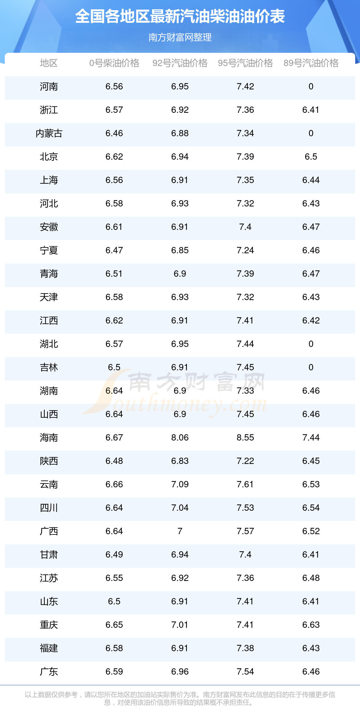 0号柴油平均价格:7元每升,其中,最高为海南,价格6.67元/升,最低为内蒙古,价格6.46元/升。
