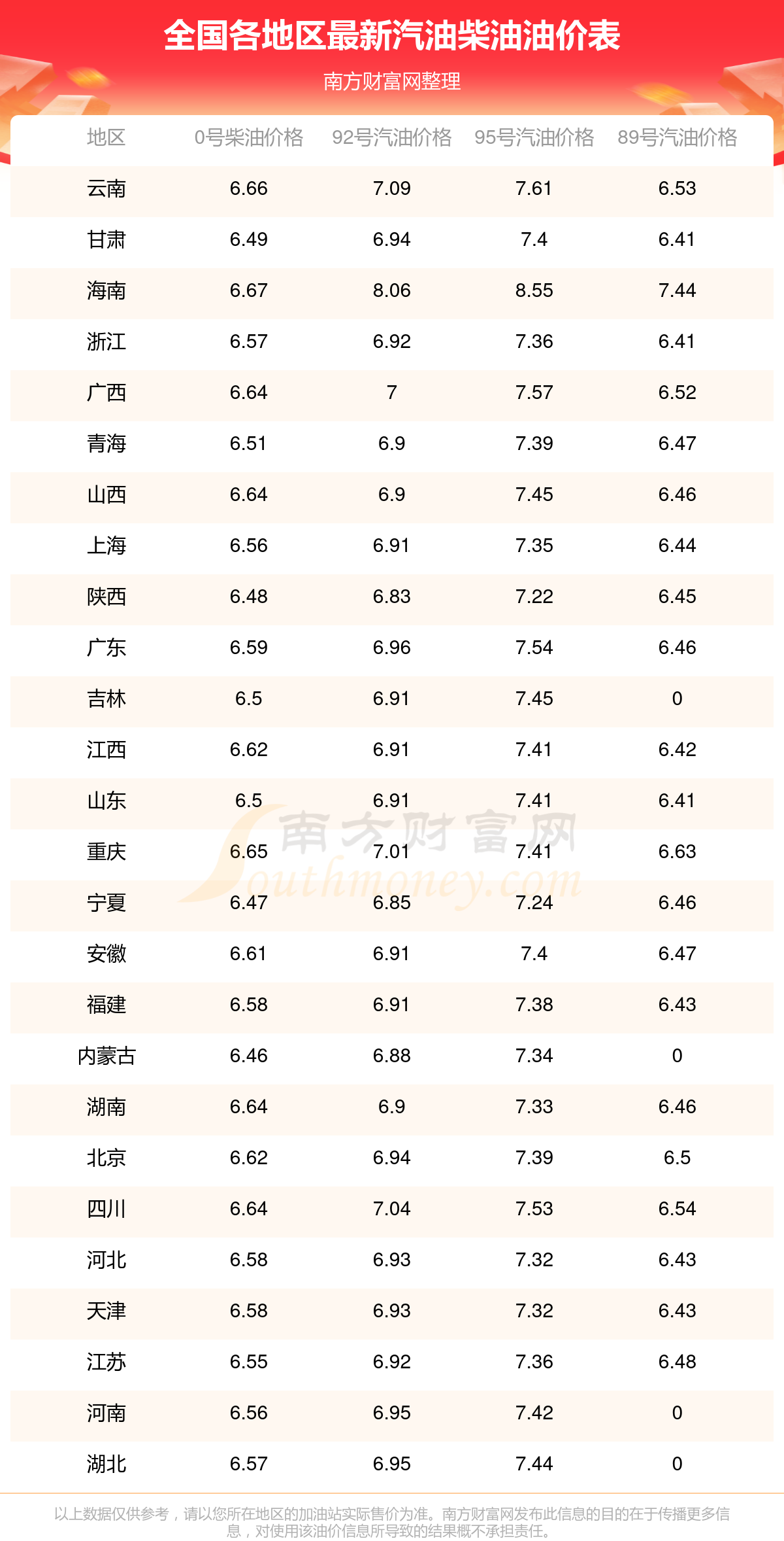 2025年11月19日全国油价调整及最新汽油价格表