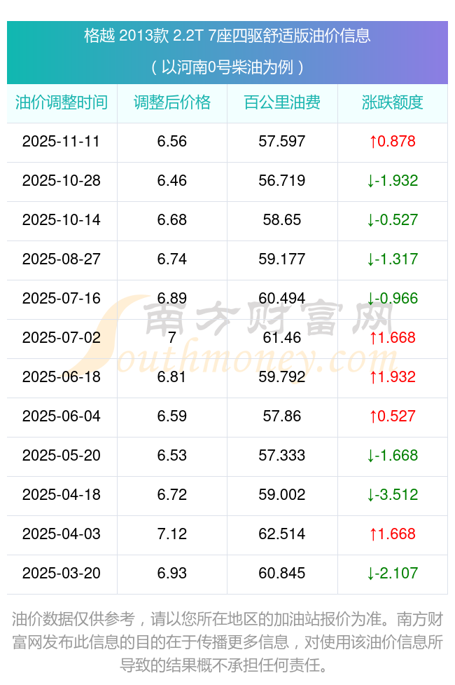 依照11月11日0号柴油最新调整价格6.56元/升来计算(以河南为例),该车型百公里的平均油费是57.597元,依照上一轮10月28日调整价格6.46元/升来计算,百公里的平均油费是56.719元,对比上一轮多花0.878元,下一轮的油价调整时间11月24日24时。