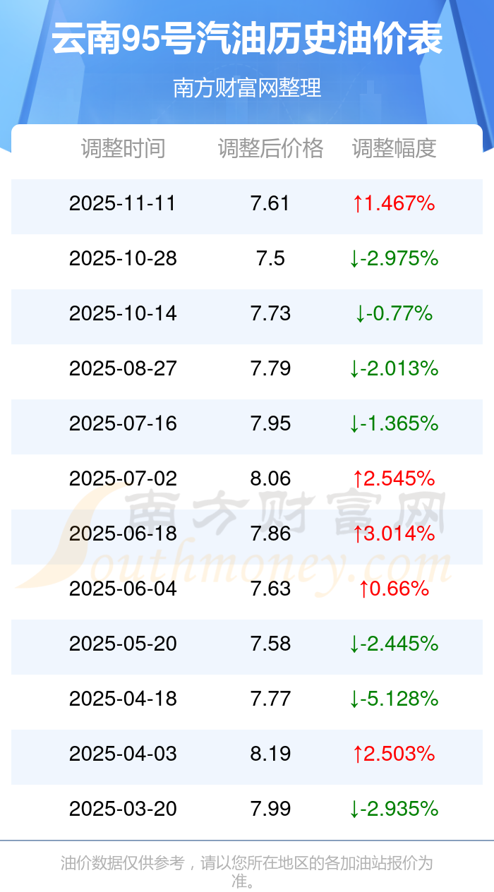 11月19日,云南95号汽油的价格是7.61元每升,本次的调整时间为11月11日,对比上次的调整上升了0.11元,上升1.467%,下次调整时间为11月24日24时,还有5.75天。