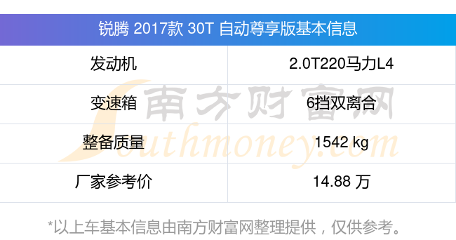锐腾 2017款 30T 自动尊享版动力上配备的是一台2.0T220马力L4涡轮增压发动机,匹配的是6挡双离合自动档变速箱,燃料形式为汽油,常规整备质量1542kg,厂家参考价14.88万元。