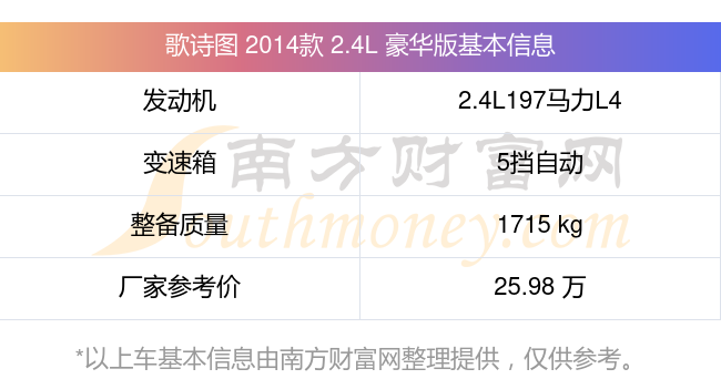 歌诗图 2014款 2.4L 豪华版动力上搭载的是一台2.4L197马力L4自然吸气发动机,匹配5挡自动档变速箱,燃料形式为汽油,常规整备质量1715kg,厂家参考价25.98万元。