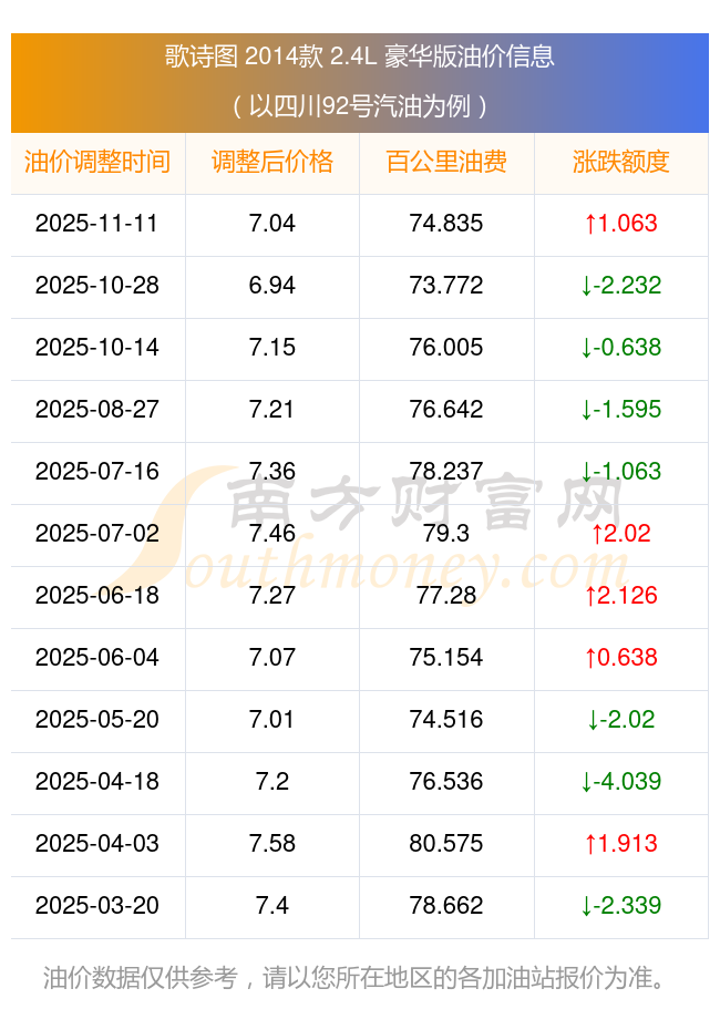 依照11月11日92号汽油最新调整价格7.04元/升来计算(以四川为例),该车型百公里的平均油费是74.835元,依照上一轮10月28日调整价格6.94元/升来计算,百公里的平均油费是73.772元,对比上一轮多花1.063元,下一轮的油价调整时间11月24日24时。
