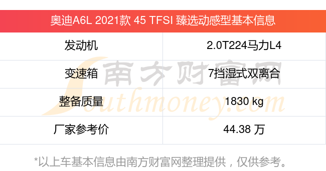 在动力方面,奥迪A6L 2021款 45 TFSI 臻选动感型搭载的是一台2.0T224马力L4涡轮增压发动机,匹配7挡湿式双离合自动档变速箱,燃料形式为汽油,常规整备质量1830kg,厂家参考价44.38万元。