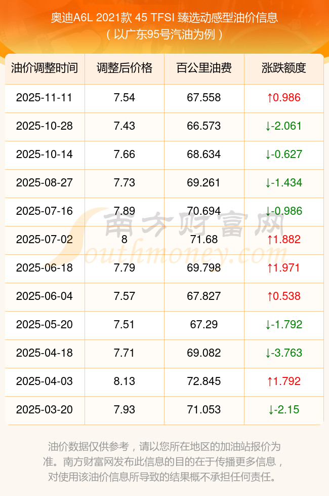 依照11月11日95号汽油最新调整价格7.54元/升来计算(以广东为例),该车型百公里的平均油费是67.558元,依照上一轮10月28日调整价格7.43元/升来计算,百公里的平均油费是66.573元,对比上一轮多花0.986元,下一轮的油价调整时间11月24日24时。