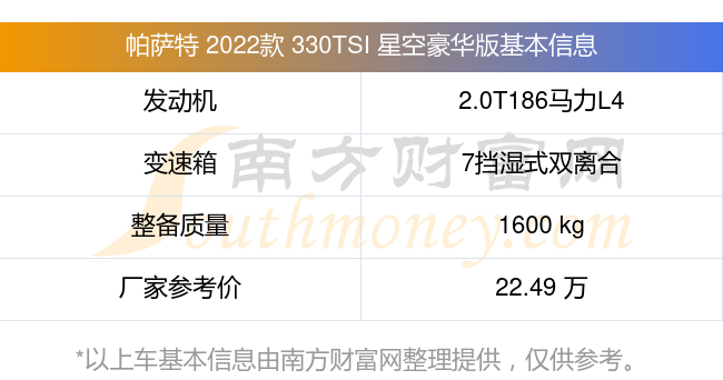 帕萨特 2022款 330TSI 星空豪华版动力上搭载的是一台2.0T186马力L4涡轮增压发动机,匹配7挡湿式双离合自动档变速箱,燃料形式为汽油,常规整备质量1600kg,厂家参考价22.49万元。