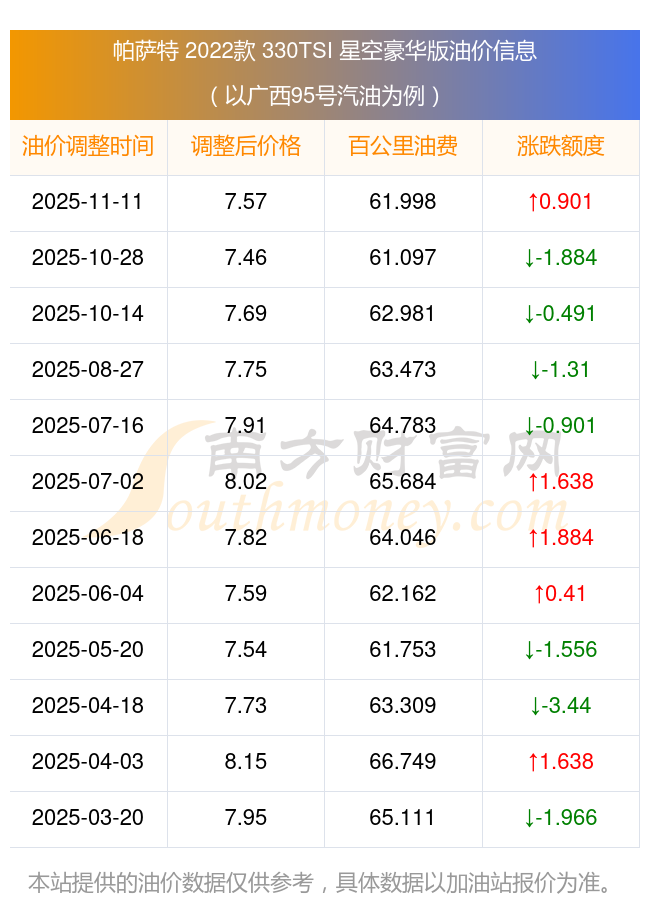 按照11月11日95号汽油最新调整价格7.57元/升来计算(以广西为例),该车型百公里平均油费为61.998元,按照上一轮10月28日调整价格7.46元/升来计算,百公里平均油费为61.097元,对比上一轮多花0.901元,下一轮油价调整时间为11月24日24时。