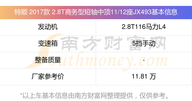 在动力上,特顺 2017款 2.8T商务型短轴中顶11/12座JX493配备的是一台2.8T116马力L4涡轮增压发动机,匹配的是5挡手动挡变速箱,燃料形式为柴油,厂家参考价11.81万元。