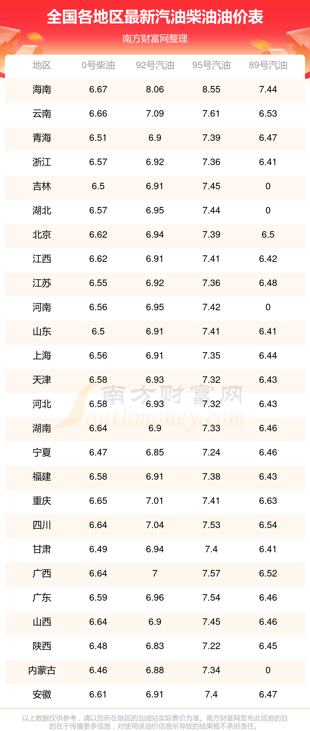2025年11月19日全国各地汽油价格一览表