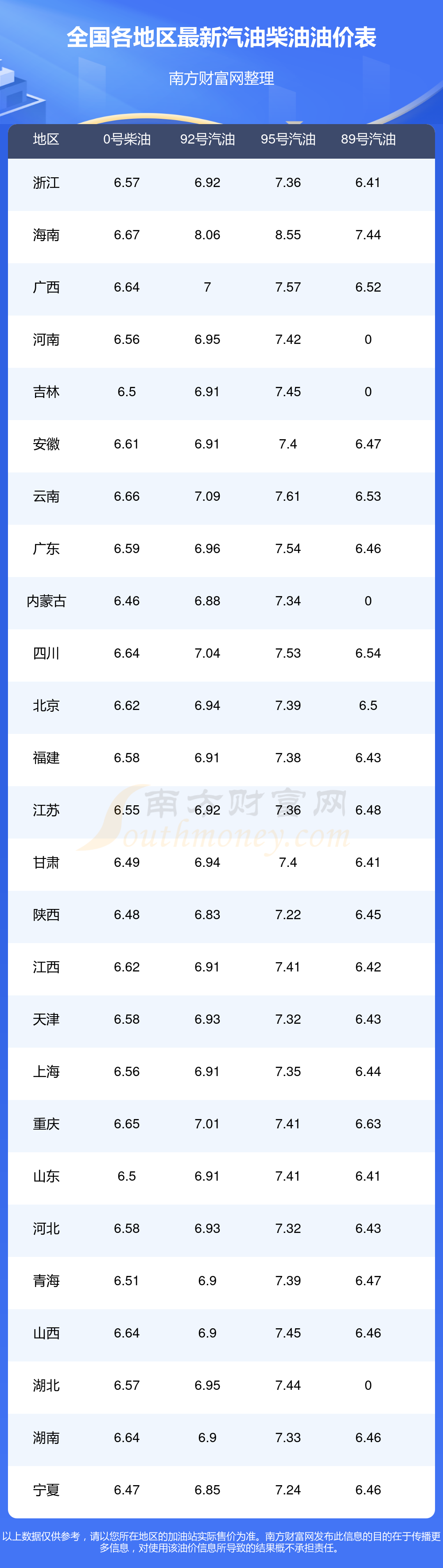 全国89号汽油11月19日最新平均价格为:7元/升,调整时间为11月11日,其中全国89号汽油最低为浙江,价格为6.41元/升,89号汽油最高为海南,价格为7.44元/升。,下一轮油价调整时间11月24日24时,距离现在还有5.67天。