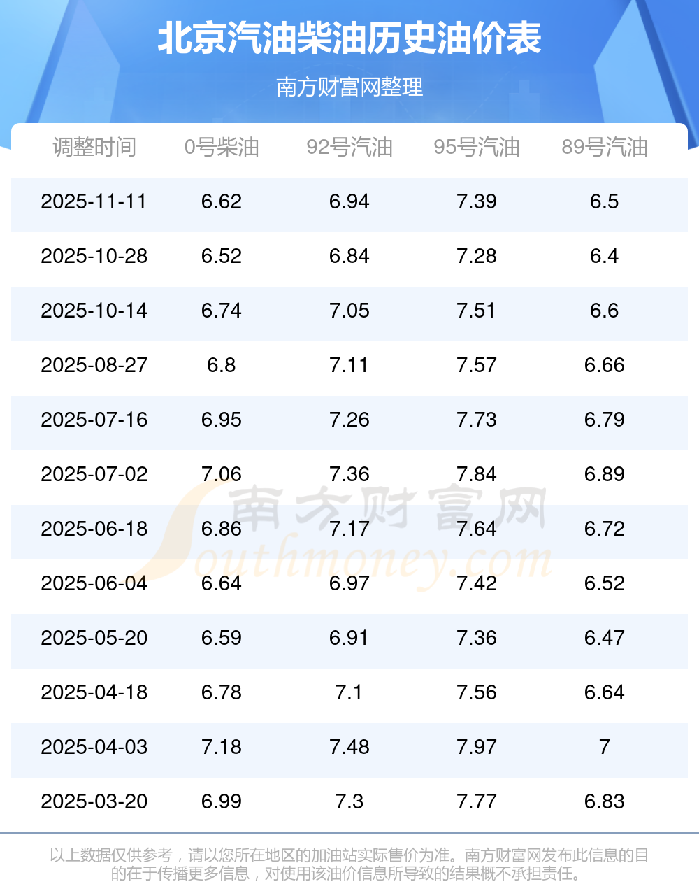 11月19日北京汽油、柴油的最新价格是11月11日调整后的价格,具体为92号汽油6.94元,上涨了0.1元,上涨幅达1.46%;95号汽油7.39元,上涨了0.11元,上涨幅达1.51%;89号汽油6.5元,上涨了0.1元,上涨幅达1.56%;0号柴油6.62元,上涨了0.1元,上涨幅达1.53%。