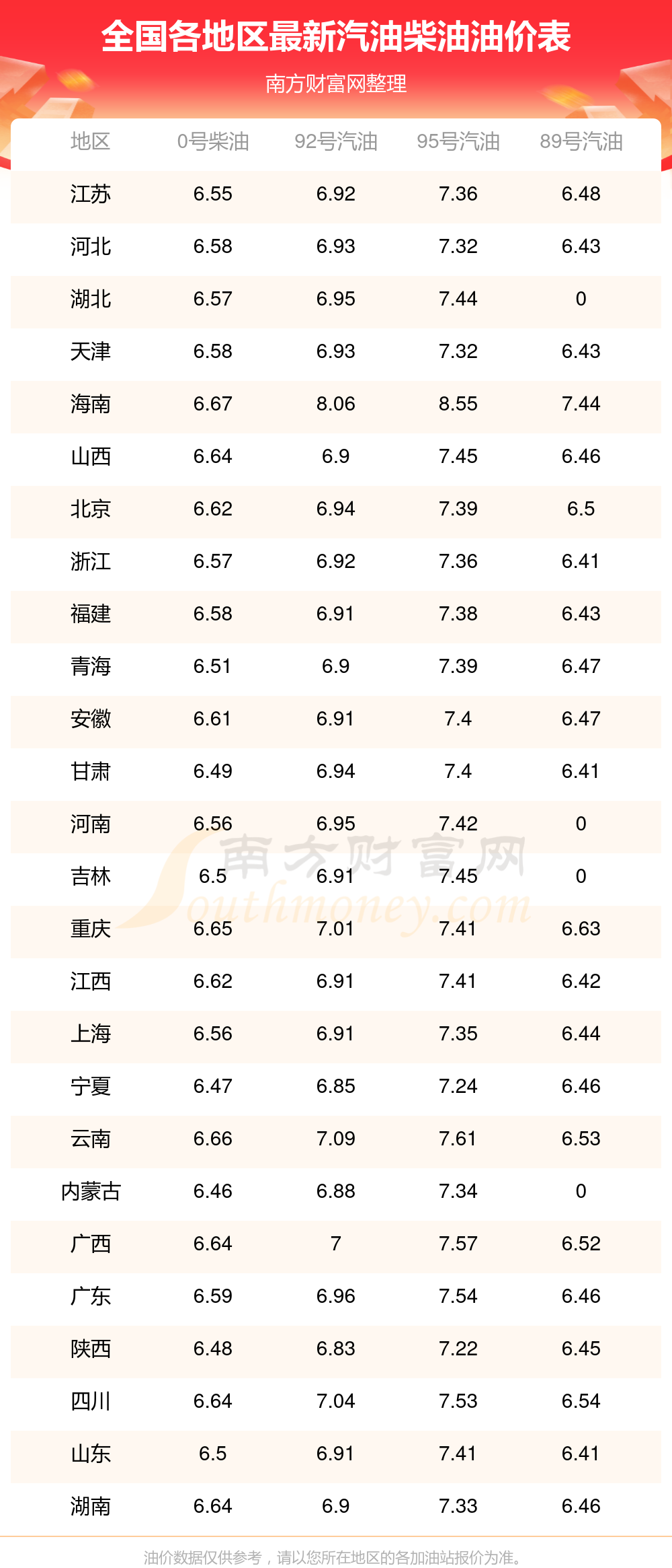 汽油价格调整最新消息:下一轮油价调整11月24日24时开启。油价最新调整时间为11月11日,全国92号汽油最新平均价格为:7元每升,其中,最低为陕西,价格为6.83元/升,最高为海南,价格为8.06元/升。全国95号汽油最新平均价格为:7元每升,其中,最低为陕西,价格为7.22元/升,最高为海南,价格为8.55元/升。全国0号柴油最新平均价格为:7元每升,其中,最低为内蒙古,价格为6.46元/升,最高为海南,价格为6.67元/升。全国89号汽油最新平均价格为:7元每升,其中,最低为浙江,价格为6.41元/升,最高为海南,价格为7.44元/升。