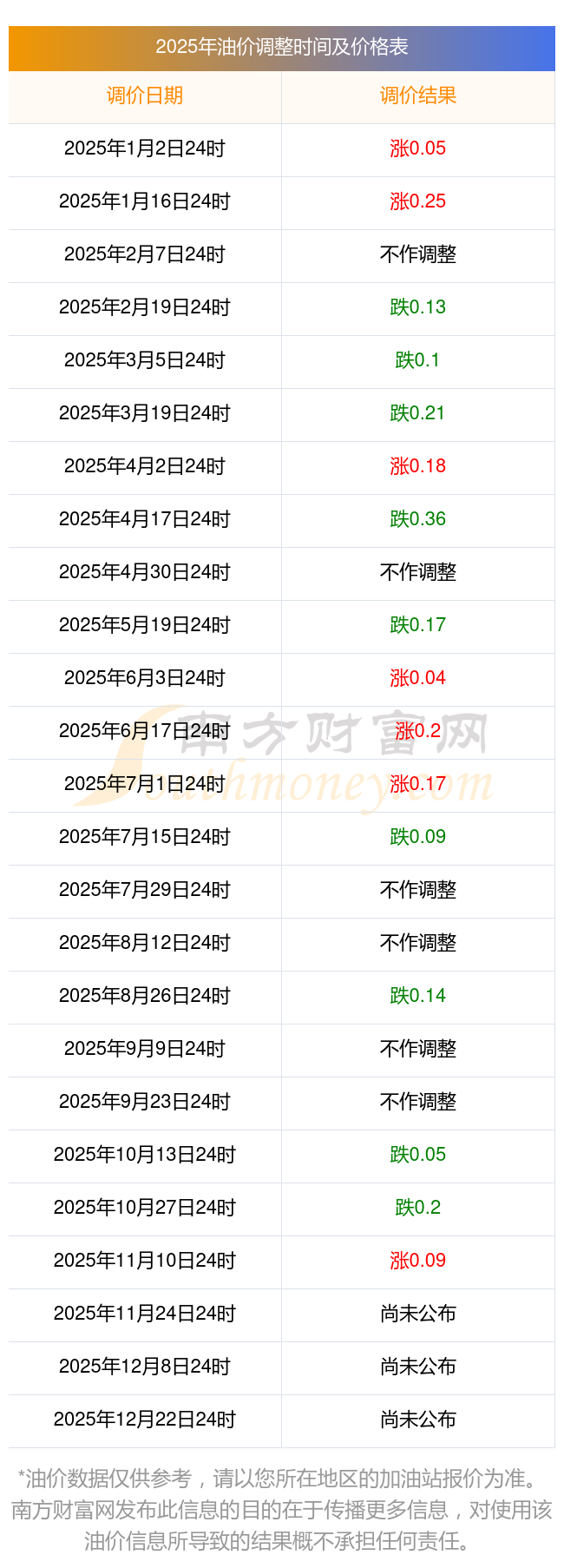 油价调整最新消息:下一轮油价调整时间11月24日24时。吴江区11月19日汽油价格详情:92号汽油6.92元;95号汽油7.36元;89号汽油6.48元;0号柴油6.55元(该价格为11月11日调整后的价格)。