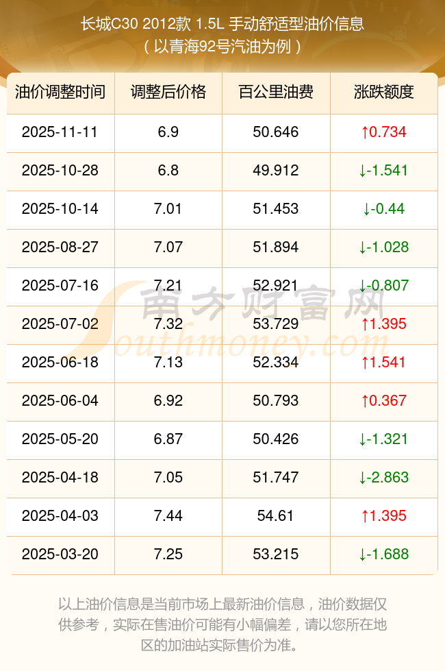 依照11月11日92号汽油最新调整价格6.9元/升来计算(以青海为例),该车型百公里的平均油费是50.646元,依照上一轮10月28日调整价格6.8元/升来计算,百公里的平均油费是49.912元,对比上一轮多花0.734元,下一轮的油价调整时间11月24日24时。