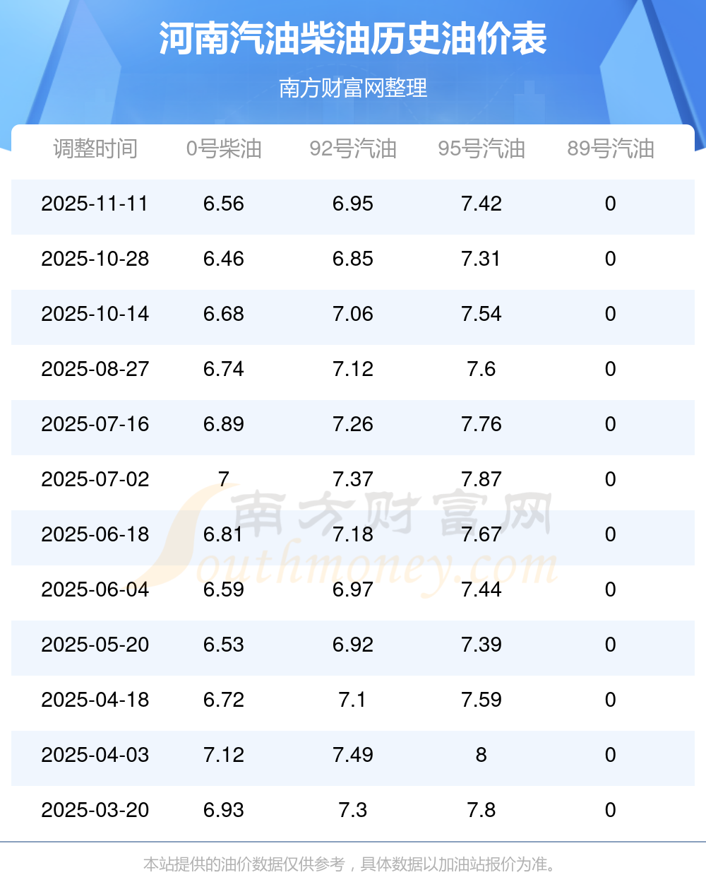 11月19日,河南0号柴油的价格是6.56元每升,本次的调整时间为11月11日,对比上次的调整上涨了0.1元,上涨1.548%,下次调整时间为11月24日24时,还有5.61天。