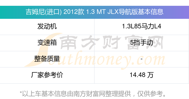 吉姆尼(进口) 2012款 1.3 MT JLX导航版搭载了一台1.3L85马力L4自然吸气发动机,采用5挡手动挡变速箱,厂家参考价14.48万元。