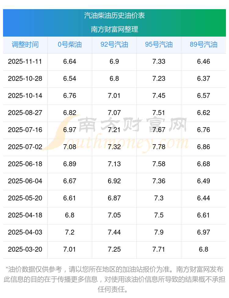 衡阳汽油柴油11月19日的价格每升多少钱?具体为:92号汽油为6.9元,涨了0.1元;95号汽油为7.33元,涨了0.11元;89号汽油为6.46元,涨了0.09元;0号柴油为6.64元,涨了0.1元,本轮油价的调整时间为11月11日。下一轮油价调整时间11月24日24时,距离现在还有5.6天。