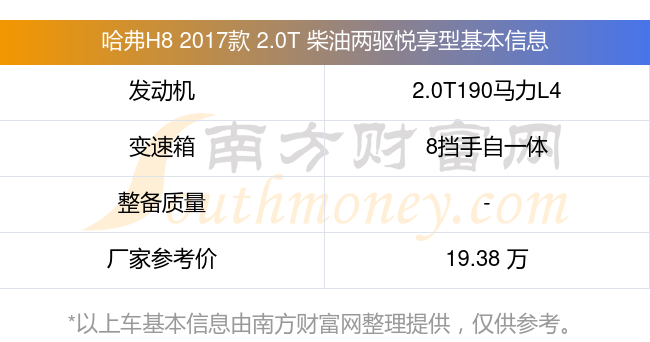 在动力上,哈弗H8 2017款 2.0T 柴油两驱悦享型配备的是一台2.0T190马力L4双涡轮增压发动机,匹配的是8挡手自一体自动档变速箱,燃料形式为柴油,厂家参考价19.38万元。