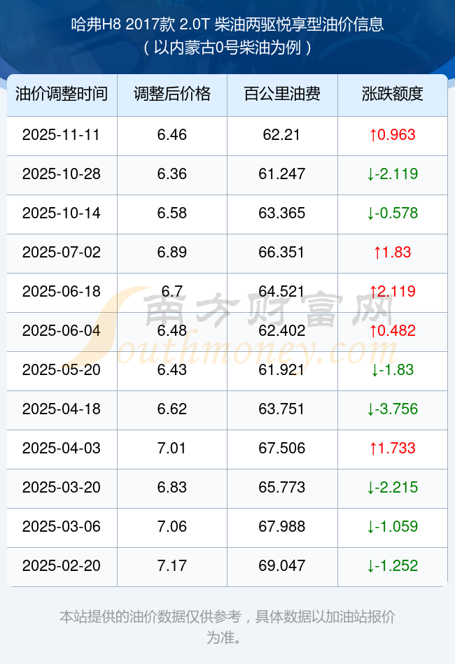 按照11月11日0号柴油最新调整价格6.46元/升来计算(以内蒙古为例),该车型百公里平均油费为62.21元,按照上一轮10月28日调整价格6.36元/升来计算,百公里平均油费为61.247元,对比上一轮多花0.963元,下一轮油价调整时间为11月24日24时。