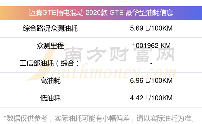 根据多位车主实测得出数据,该车型低油耗为4.42L/100km,高油耗为6.96L/100km,综合路况众测油耗为5.69L/100km,工信部综合油耗为-L/100km。