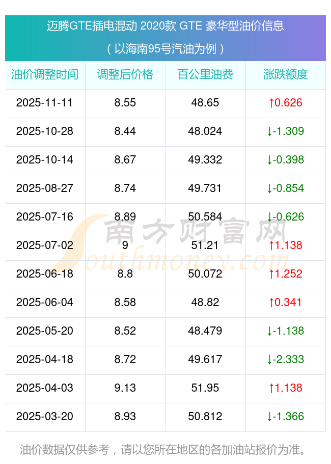依照11月11日95号汽油最新调整价格8.55元/升来计算(以海南为例),该车型百公里的平均油费是48.65元,依照上一轮10月28日调整价格8.44元/升来计算,百公里的平均油费是48.024元,对比上一轮多花0.626元,下一轮的油价调整时间11月24日24时。