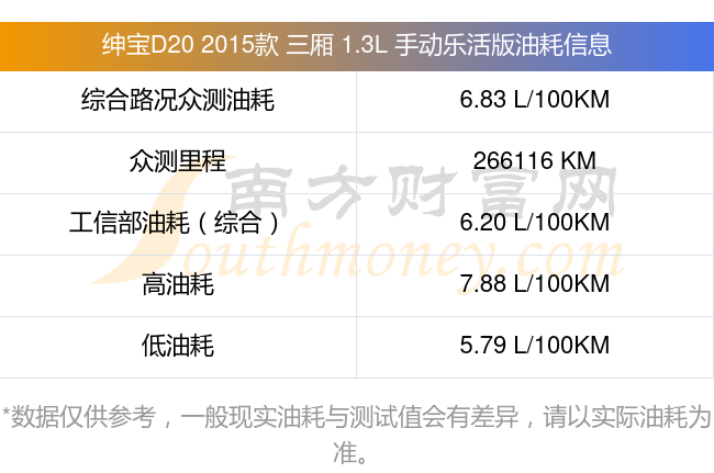 根据多位车主实测得出数据,该车型低油耗为5.79升每百公里,高油耗为7.88升每百公里,综合路况众测油耗为6.83升每百公里,工信部综合油耗为6.20升每百公里。