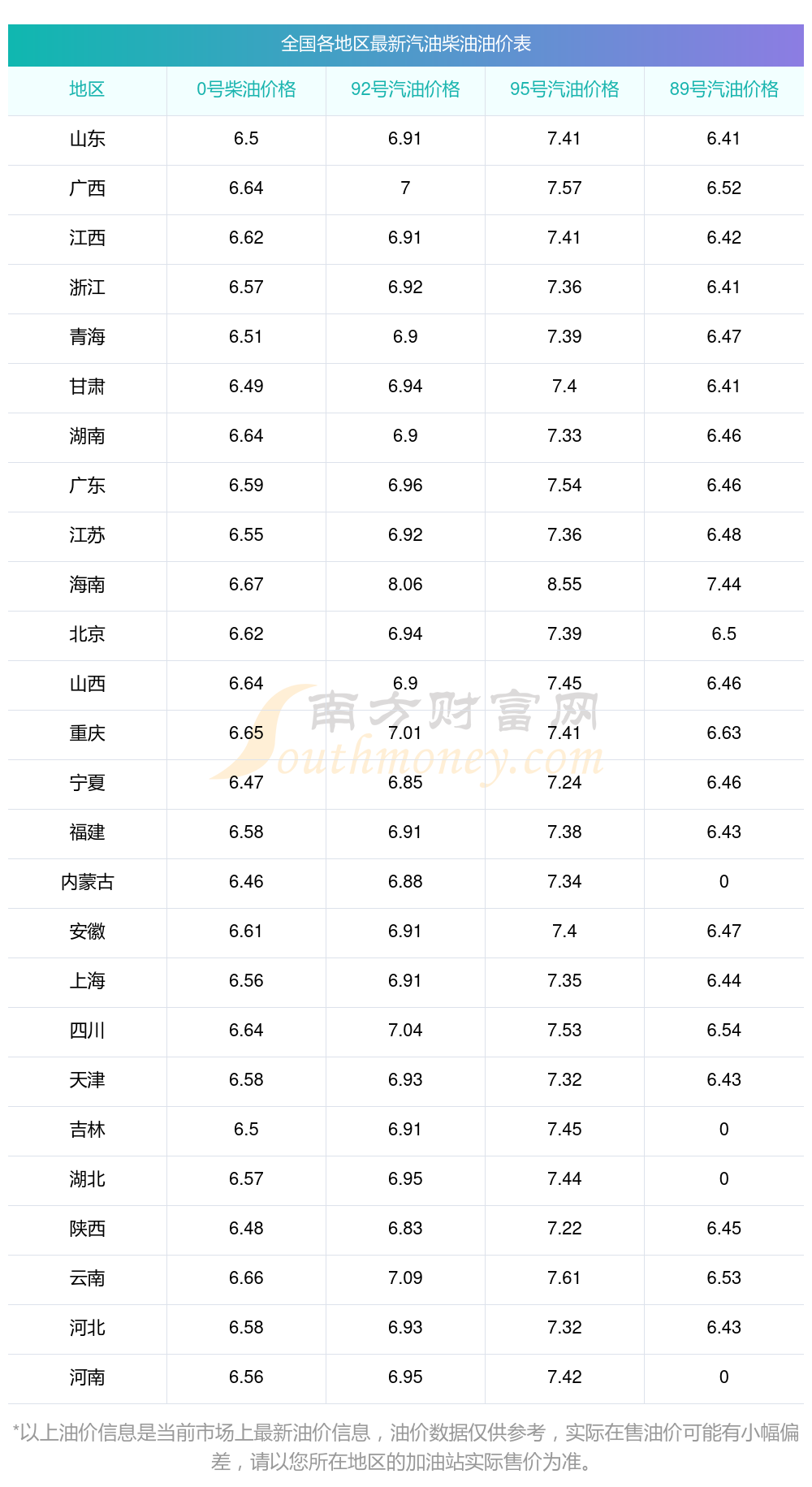 以上油价信息是当前市场上最新油价信息,油价数据仅供参考,实际在售油价可能有小幅偏差,请以您所在地区的加油站实际售价为准。