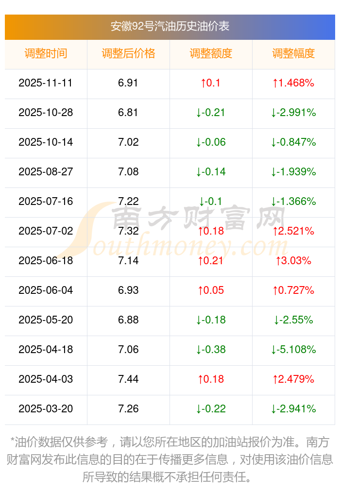 11月19日,安徽92号汽油的价格是6.91元每升,本次的调整时间为11月11日,对比上次的调整涨了0.1元,涨1.468%,11月24日24时为下一轮油价调整时间,还有5.56天。