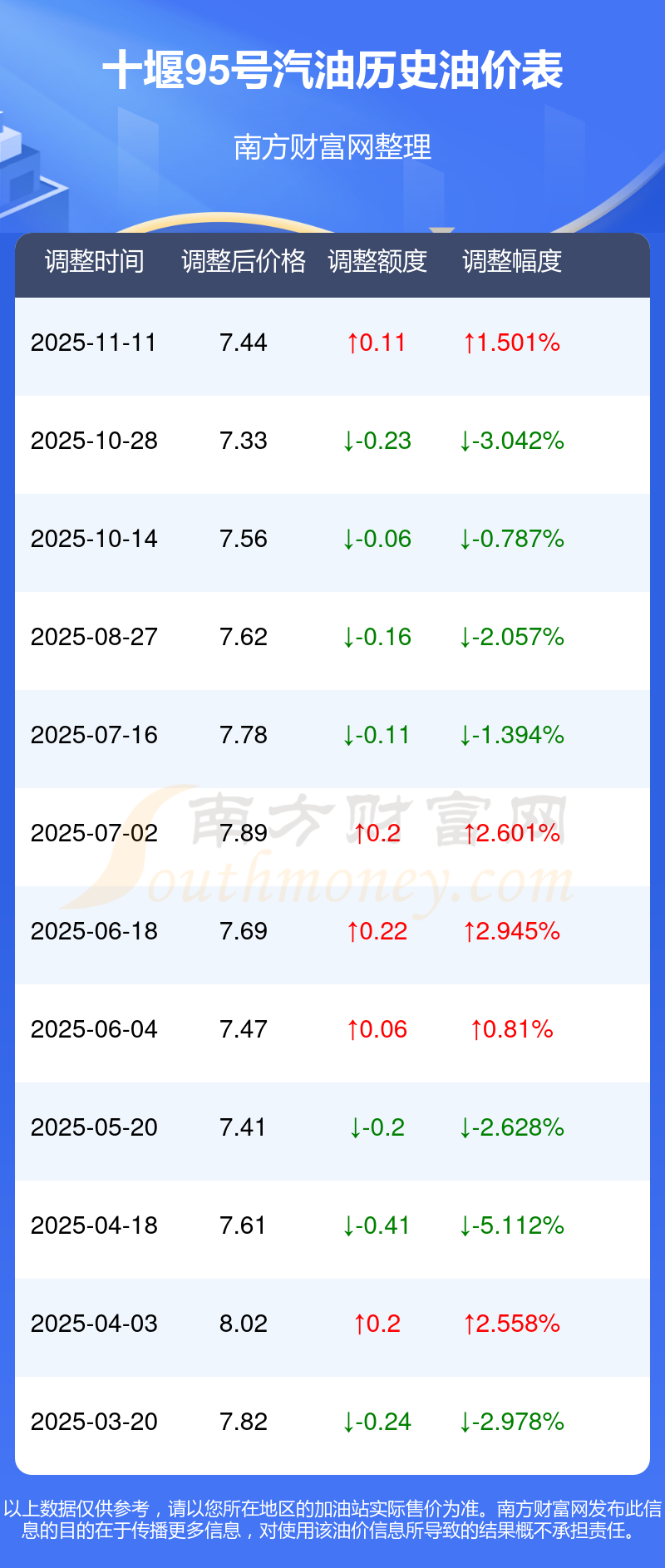 11月19日十堰95号汽油的价格为11月11日油价调整后的价格,具体是每升7.44元,相对上次调整时间10月28日的油价7.33元每升,共升了0.11元,升1.501%。下一轮油价调整时间11月24日24时,距离现在还有5.55天。