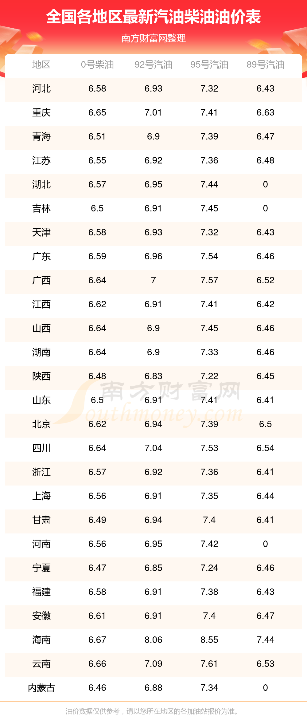 油价调整最新消息:下一轮油价调整时间11月24日24时。徐州新沂市汽油、柴油11月19日的价格是多少钱一升?具体如下:92号汽油为6.92元,上调了0.1元;95号汽油为7.36元,上调了0.11元;89号汽油为6.48元,上调了0.09元;0号柴油为6.55元,上调了0.11元,本轮油价的调整时间为11月11日。