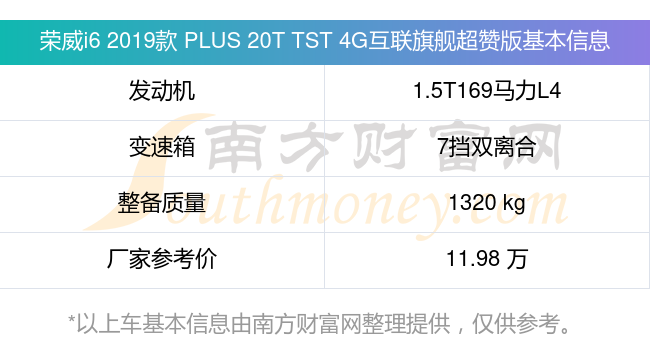 荣威i6 2019款 PLUS 20T TST 4G互联旗舰超赞版搭载了一台1.5T169马力L4涡轮增压发动机,采用7挡双离合自动档变速箱,常规整备质量1320kg,厂家参考价11.98万元。
