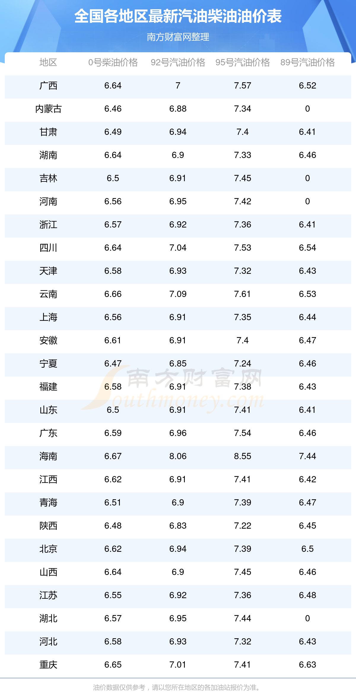 2025年11月19日全国各地油价调整及最新汽油价格表