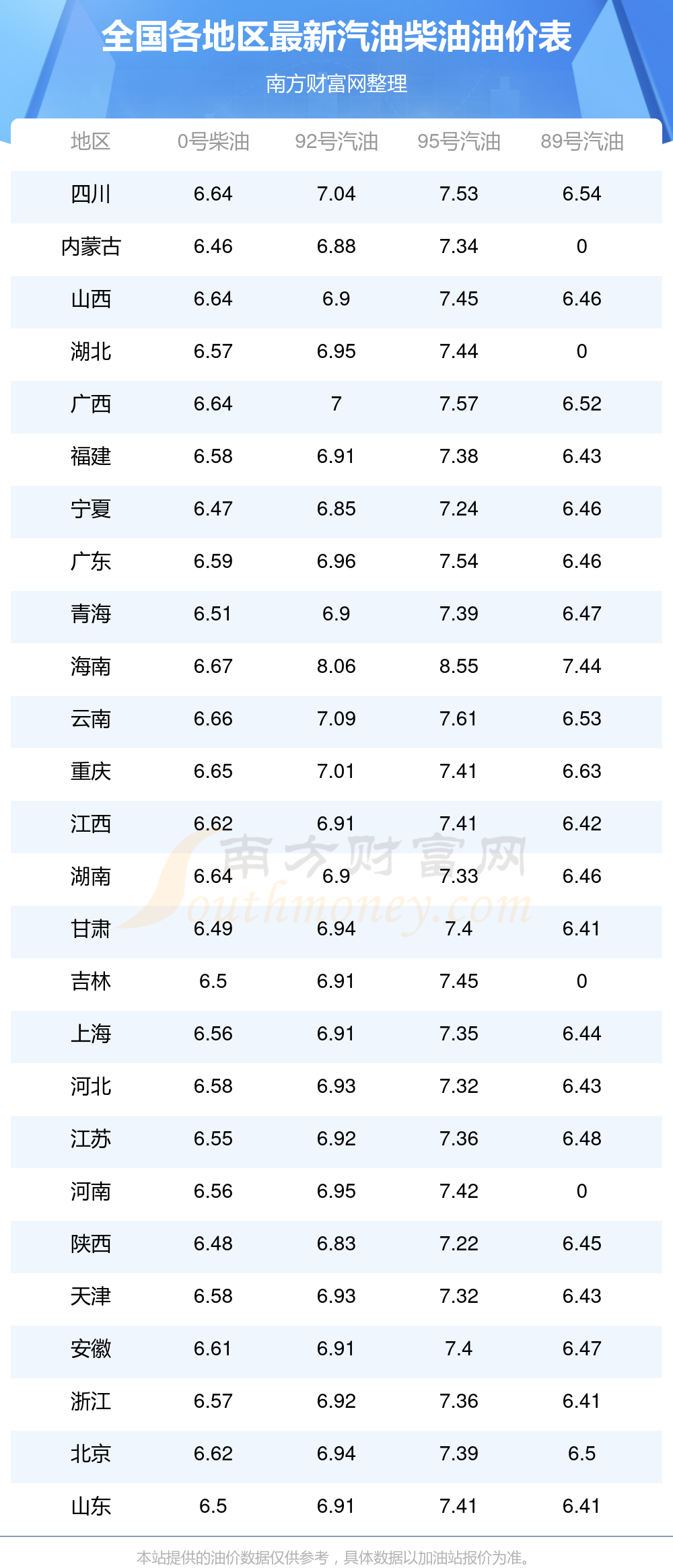 全国各地区最新油价表