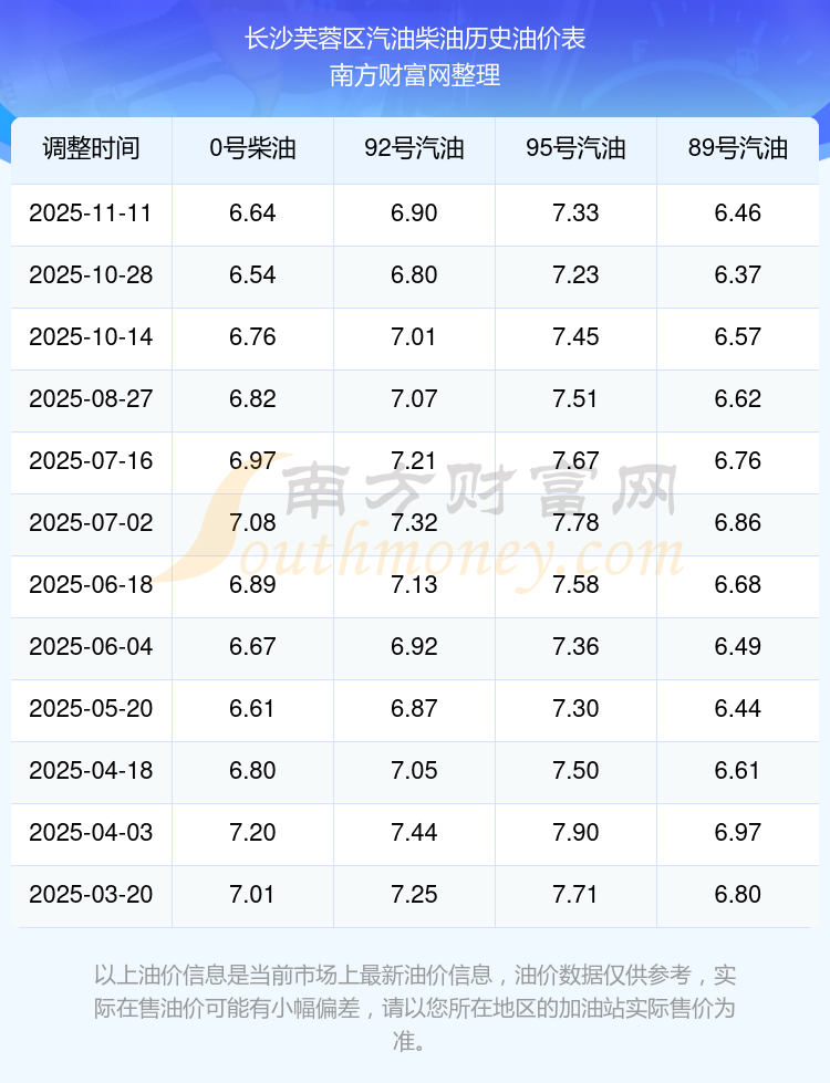 油价调整最新消息:下一轮油价调整时间11月24日24时。11月19日长沙芙蓉区汽油柴油每升的价格为11月11日调整后的价格,具体如下:92号汽油6.9元;95号汽油7.33元;89号汽油6.46元;0号柴油6.64元。