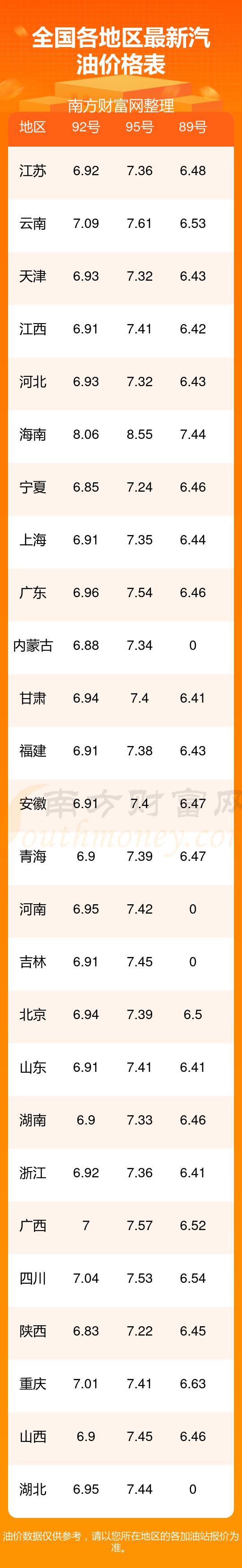 以上油价信息是当前市场上最新油价信息,油价数据仅供参考,实际在售油价可能有小幅偏差,请以您所在地区的加油站实际售价为准。