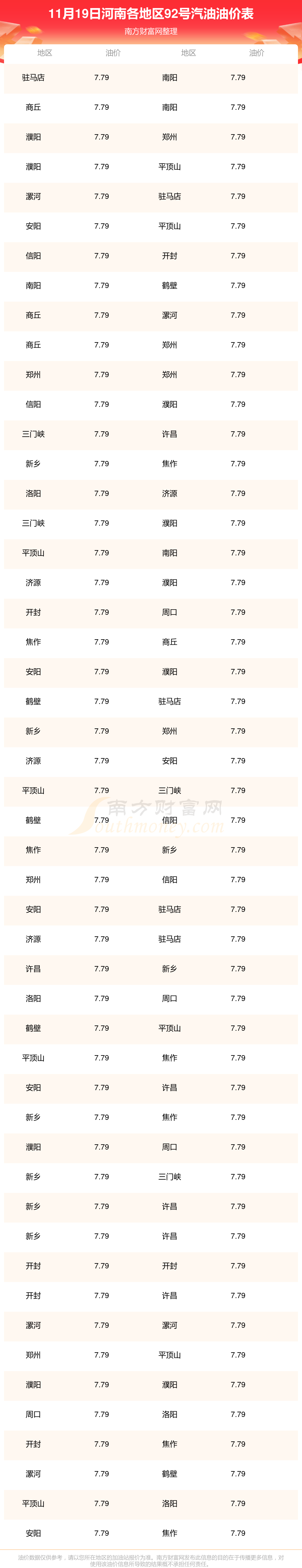 2025年11月19日河南92号汽油最新价格一览表
