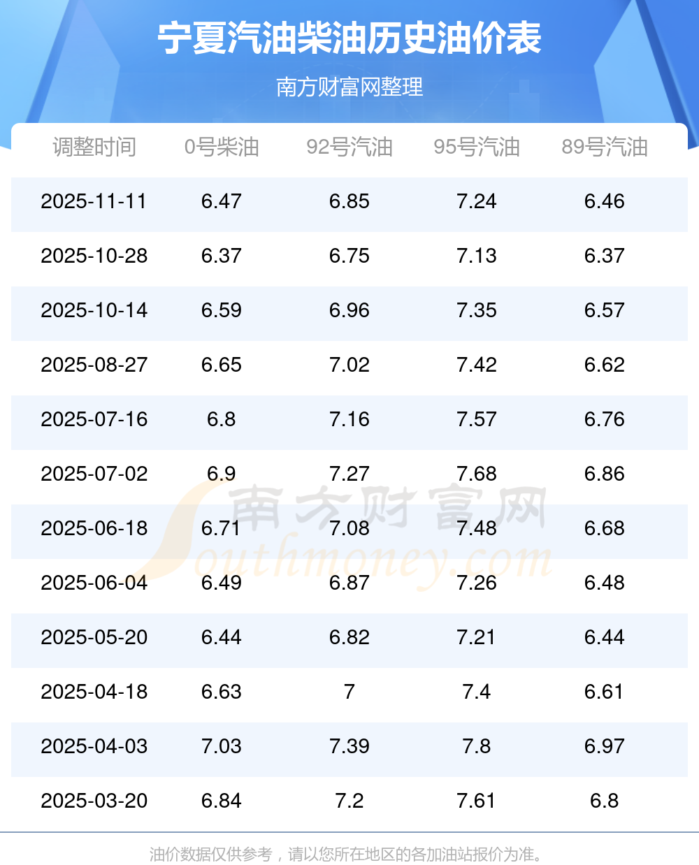 按11月11日0号柴油最新调整价格6.47元每升来计算(以宁夏为例),该车型百公里平均油费为56.418元,按上一轮10月28日调整价格6.37元每升来计算,百公里平均油费为55.546元,对比上一轮多花0.872元,下一轮油价调整时间为11月24日24时。