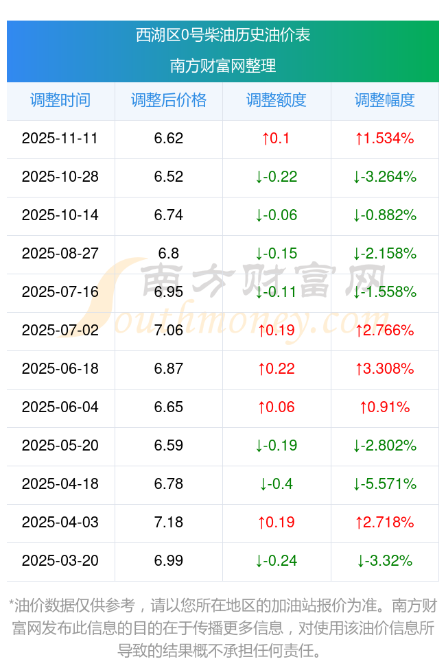 西湖区0号柴油历史油价一览表