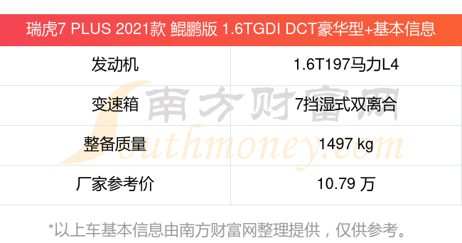瑞虎7 PLUS 2021款 鲲鹏版 1.6TGDI DCT豪华型+动力上配备的是一台1.6T197马力L4涡轮增压发动机,匹配的是7挡湿式双离合自动档变速箱,燃料形式为汽油,常规整备质量1497kg,厂家参考价10.79万元。