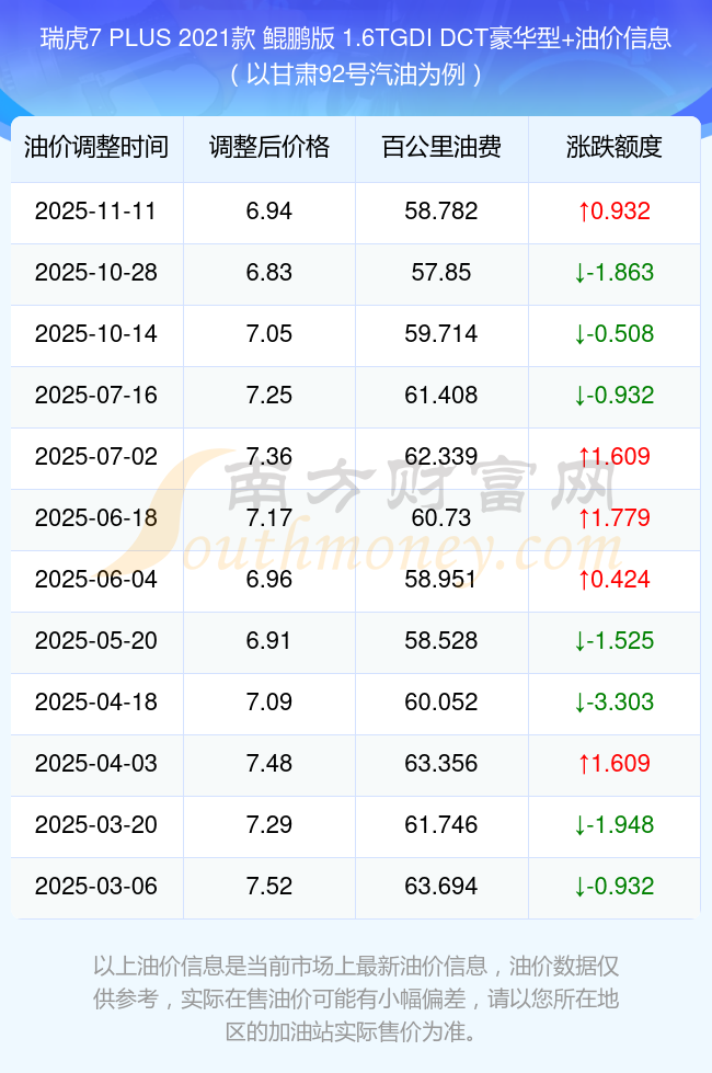 依照11月11日92号汽油最新调整价格6.94元/升来计算(以甘肃为例),该车型百公里的平均油费是58.782元,依照上一轮10月28日调整价格6.83元/升来计算,百公里的平均油费是57.85元,对比上一轮多花0.932元,下一轮的油价调整时间11月24日24时。